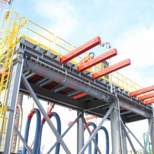A hose tower is used to support (multiple) hoses from the jetty to (oil) tankers for loading and unloading. A hose tower is a steel construction that contains hoses, one or more telescopic cranes, hydraulic winches, sliding beams and hose buns. The crane hoist the hose on board of the vessel. The winch and sliding beam support the hoses during handling.